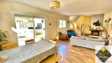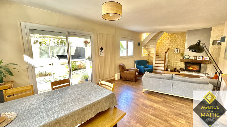 - d'un RdC avec une entrée, un séjour double avec cheminée, une cuisine US équipée, 2 chambres, une salle de bains récente et un wc suspendu.