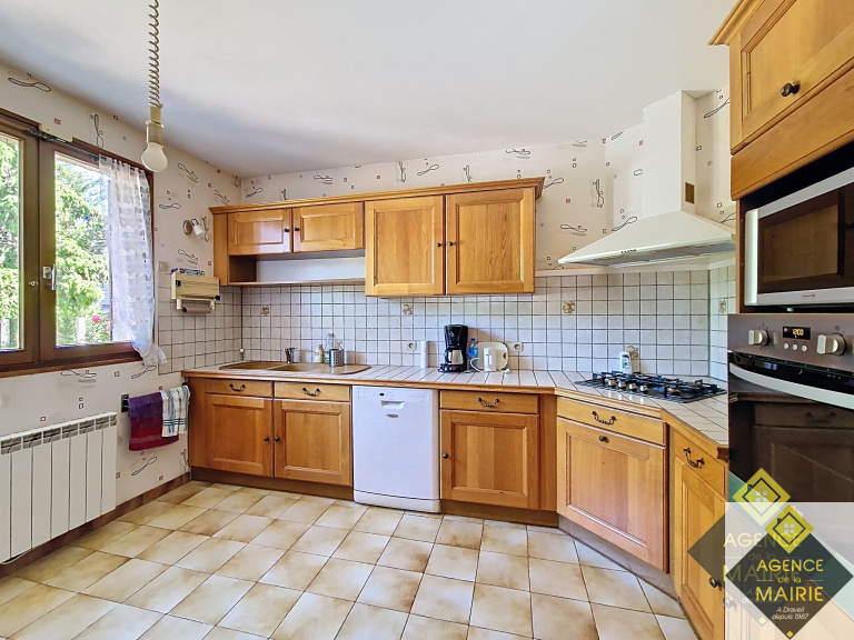 - au rez-de-chaussée : d'une entrée avec placard, d'une cuisine dinatoire, d'un séjour double avec cheminée, accès à la terrasse et au jardin, WC indépendant. Garage