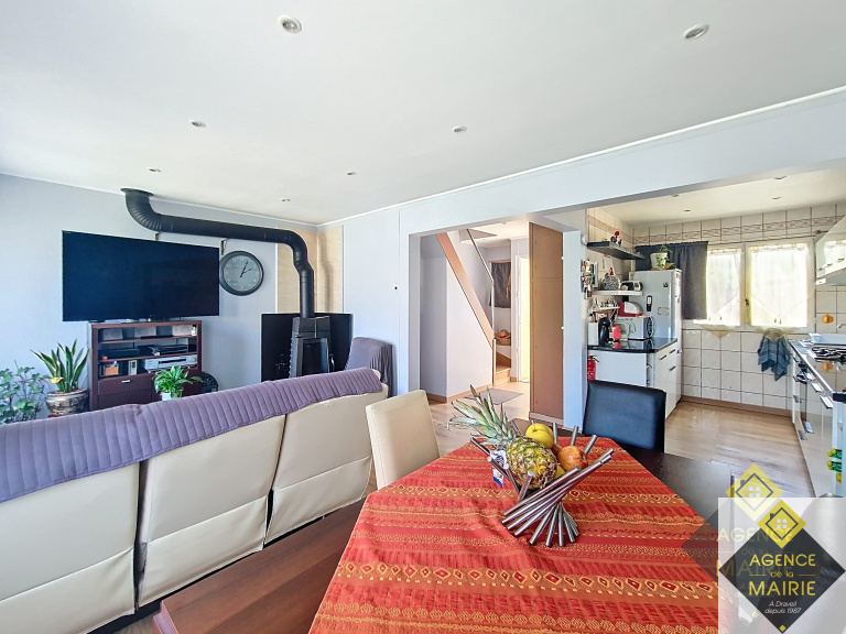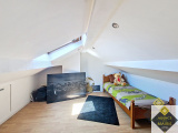 Elle est composée au rez-de chaussée, Entrée avec placard, cuisine ouverte sur le séjour avec son poêle à bois, deux chambres, une salle d'eau avec wc, à l'étage un grenier aménagée.